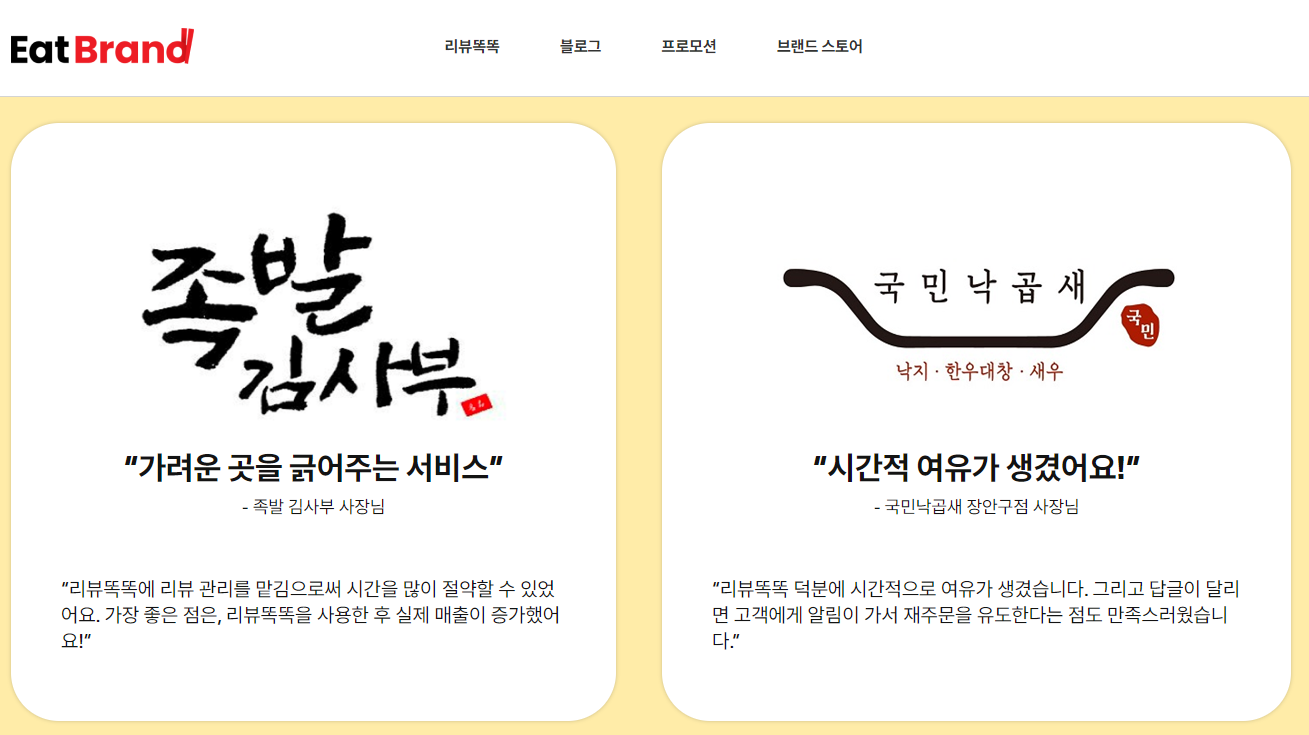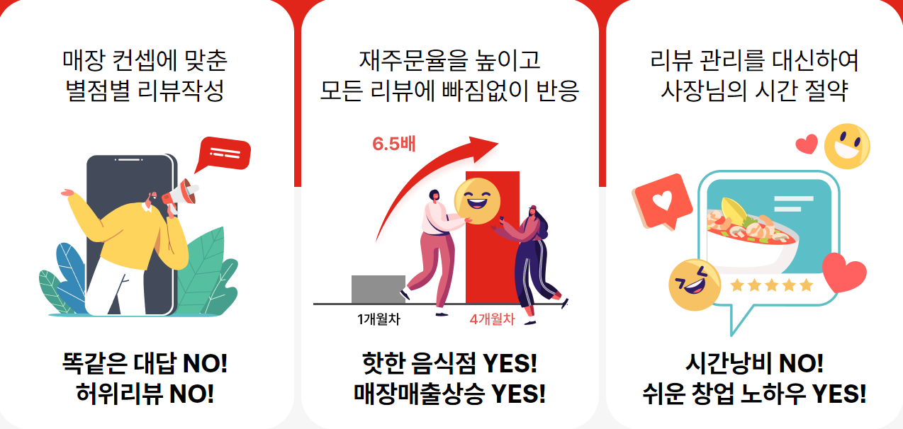 리뷰똑똑을 이용하고 있는 사장님들의 이야기를 들어보면 매출 증가가 눈에 보일 정도로 사용에 대한 만족도가 높은 점을 알 수 있는데요, 더이상 배달앱 리뷰 관리로 고민하지 말고 리뷰똑똑으로 시작해보세요. 시간 절약부터 매출 증가까지 놀라운 경험이 기다리고 있답니다.