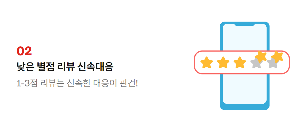 배민리뷰를 포함해 가장 관리하기 어려운 점은 낮은 별점에 빠른 대응을 하기 어렵다는 점입니다. 특히 1~3점대 리뷰는 매출에 상당한 영향을 주기 때문에 더욱 관리가 필요한데요, 리뷰똑똑을 이용하면 1~3점대 낮은 별점 리뷰에 신속하게 대응할 수 있습니다.