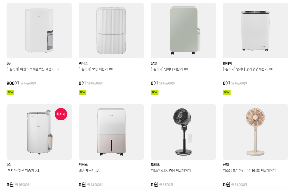 제습기 렌탈도 이벤트가 시작되어 월 900원 비용으로 렌탈이 가능합니다. 제품에 따라 별도의 비용이 지급하지 않을수도 있는데요, 올여름  LG헬로렌탈에서 원하는 제품을 선택하고  초기 구매비용에 대한 부담과  카드할인까지 모두 챙겨 합리적인 비용으로 무더위를 탈출해 보시기 바랍니다.