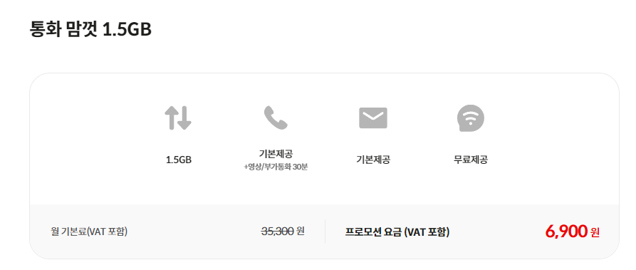 통화 맘껏 시리즈 요금제 중에서 가장 저렴한 요금제는 통화 맘껏 1.5GB 요금제로 통화 문자 무제한 이용 가능한 요금제를 월 6천 원대로 이용 가능한 요금제입니다. 1만 원 이하 요금제 중 통화 문자 무제한으로 이용 가능한 요금제로는 단연 원탑이라고 할 수 있습니다.