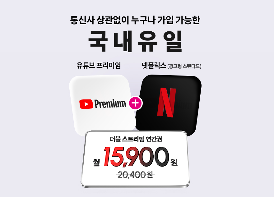 유독 더블스트리밍 서비스는 월 5,500원으로 이용 가능한 넷플릭스 광고형 스탠다드와 월 14,900원으로 이용 가능한 유튜브 프리미엄 상품이 결합된 방식으로 많은 분들이 이용하고 있는 서비스로 구성된 상품이라고 할 수 있습니다. 무엇보다 두 서비스 조합으로 구성된 구독은 어디에도 없어 유일무이합니다.