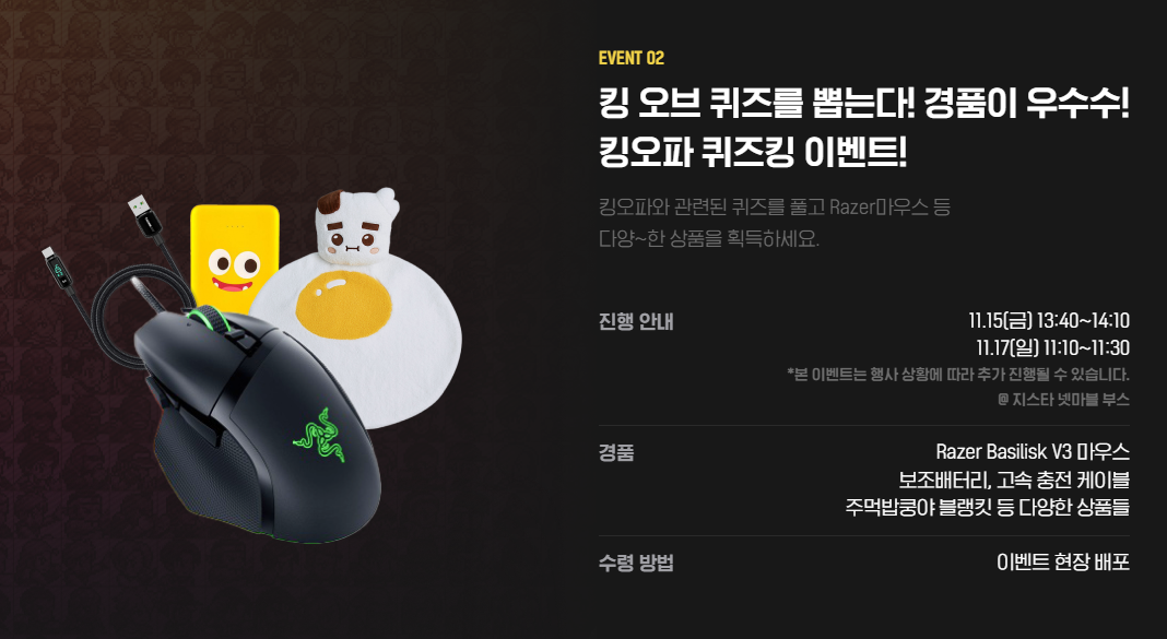 현장에서 진행되는 이벤트도 다양하게 준비되어 있습니다. 11월 14일부터 17일까지 넷마블 부스 무대에서는 넷마블 G-STAR 경품 퀴즈쇼가 진행되는데요, 참여한 분들에게는 넷마블 게임 쿠폰북을 비롯해 넷마블프렌즈 텀블러 머그 등 다양한 경품을 수령할 수 있습니다.