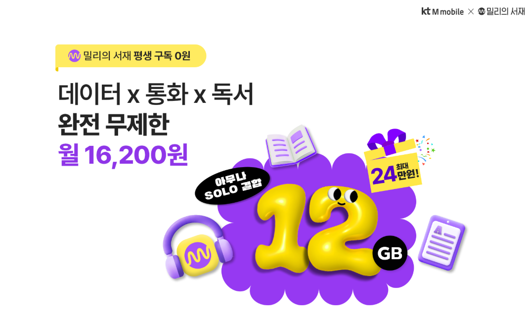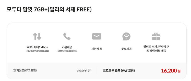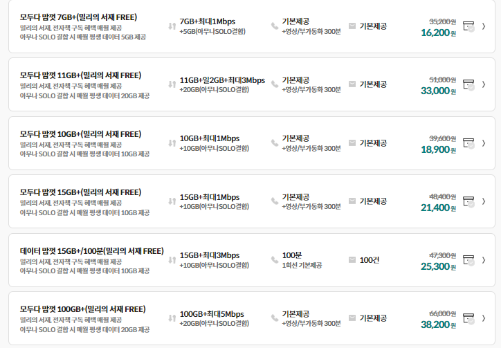 밀리의 서재 구독이 포함된 요금제중 가장 저렴한 모두다 맘껏 7GB+밀리의 서재 FREE) 요금제는 데이터 7GB+( 아무나 SOLO 결합 시 추가 5GB)가 제공되며 이를 모두 소진하더라도 최대 1 Mbps 데이터 무제한 이용이 가능합니다. 또한 통화 무제한, 문자 무제한 서비스까지 제공되고 있는데요, 가장 가성비 으뜸인 요금제라고 할 수 있습니다.