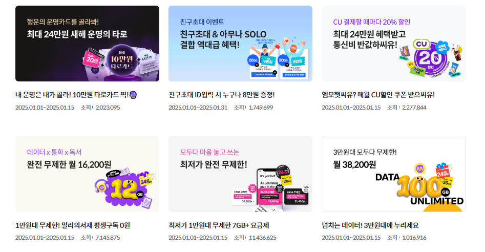 자세히 소개해드린 혜택과 이벤트 외에도 현재 진행중인 이벤트가 다양하게 준비되어 있습니다. 최대 24만 원 새해 운명의 타로를 시작으로 통신비 반값이벤트, 최저가 요금제, 3만 원대 모두다 무제한까지 정말 다양하게 준비되어 있어 일일이 나열하기 어려울 정도입니다. 최근 고물가 시대 통신비는 절약하고 받을 수 있는 혜택은 모두 다 챙겨보고 싶다면 kt M모바일 홈페이지에 접속해 준비된 요금제와 혜택들을 살펴보고 내게 꼭 맞는 선택을 해보시길 추천드립니다.