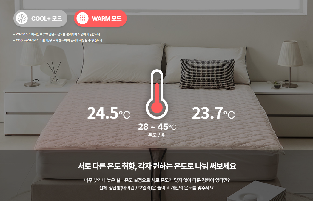 AI 수면모드만큼 마음에 드는 기능 바로 온도를 분리해 사용가능하다는 점입니다. 개개인의 취향이 다르듯 숙면을 취하는 온도도 다르기 마련인데요, 나비엔 숙면매트 사계절 Pro에서는 각자 원하는 온도로 나눠 사용할 수 있어 매트 온도 때문에 다툴 필요가 없을 정도입니다. 여기에 개인에 맞춘 매트 온도 설정이 가능하니 전체 냉난방을 줄일 수 있기도 하고 말이죠.