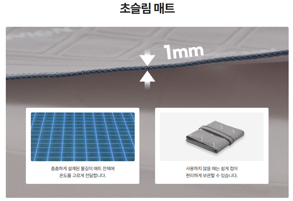 촘촘하게 설계된 물길이 매트 전체에 깔려 있어 온도를 고르게 전달하고, 1mm에 달하는 초슬림매트로 사용하지 않을 때는 쉽게 접어 편리하게 보관도 가능합니다. 무엇보다 매트 밑에 뭔가 깔려 있는 게 거슬려 잠자리를 불편해하시는 분들도 많으실 텐데, 거의 느껴지지 않을 정도로 얇아서 거슬림을 염려할 필요가 없을 듯합니다.