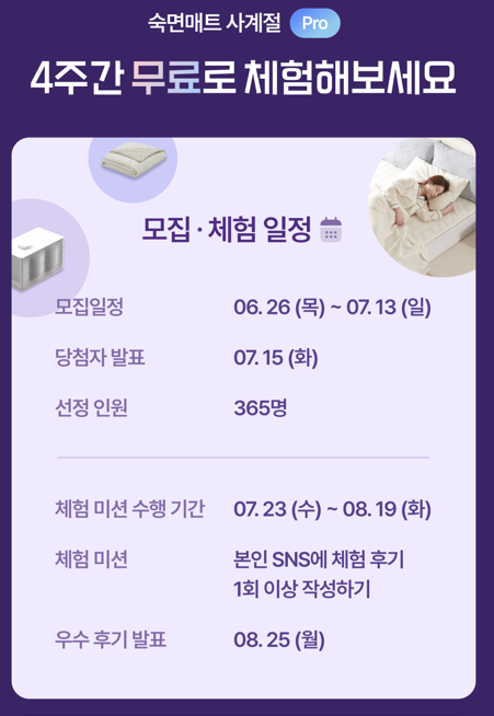 나비엔 숙면매트 사계절 Pro 체험단은 7월 13일까지 참여 인원을 모집해 최종 7월 15일에 당첨자를 발표하고 체험을 진행하는데요, 체험 미션도 본인의 SNS에 체험후기 1회 이상만 작성하면 되기 때문에 어렵지 않아 SNS를 사용하고 있는 분들이라면 부담 없이 참여할 수 있습니다.