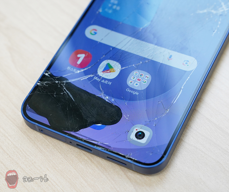 당시 파손된 핸드폰입니다. 말 그대로 액정이 파사삭 부숴지고 본체 뒷면까지 벌어진 상태였습니다. 언제 핸드폰을 사용하지 못하는 상황이 오더라도 이상하지 않을 정도였어요. 문제는 한시라도 빨리 AS를 받아야 하는데 하필이면 중요한 선약이 있어 바로 AS센터를 방문할 수가 없는 상황이었습니다.