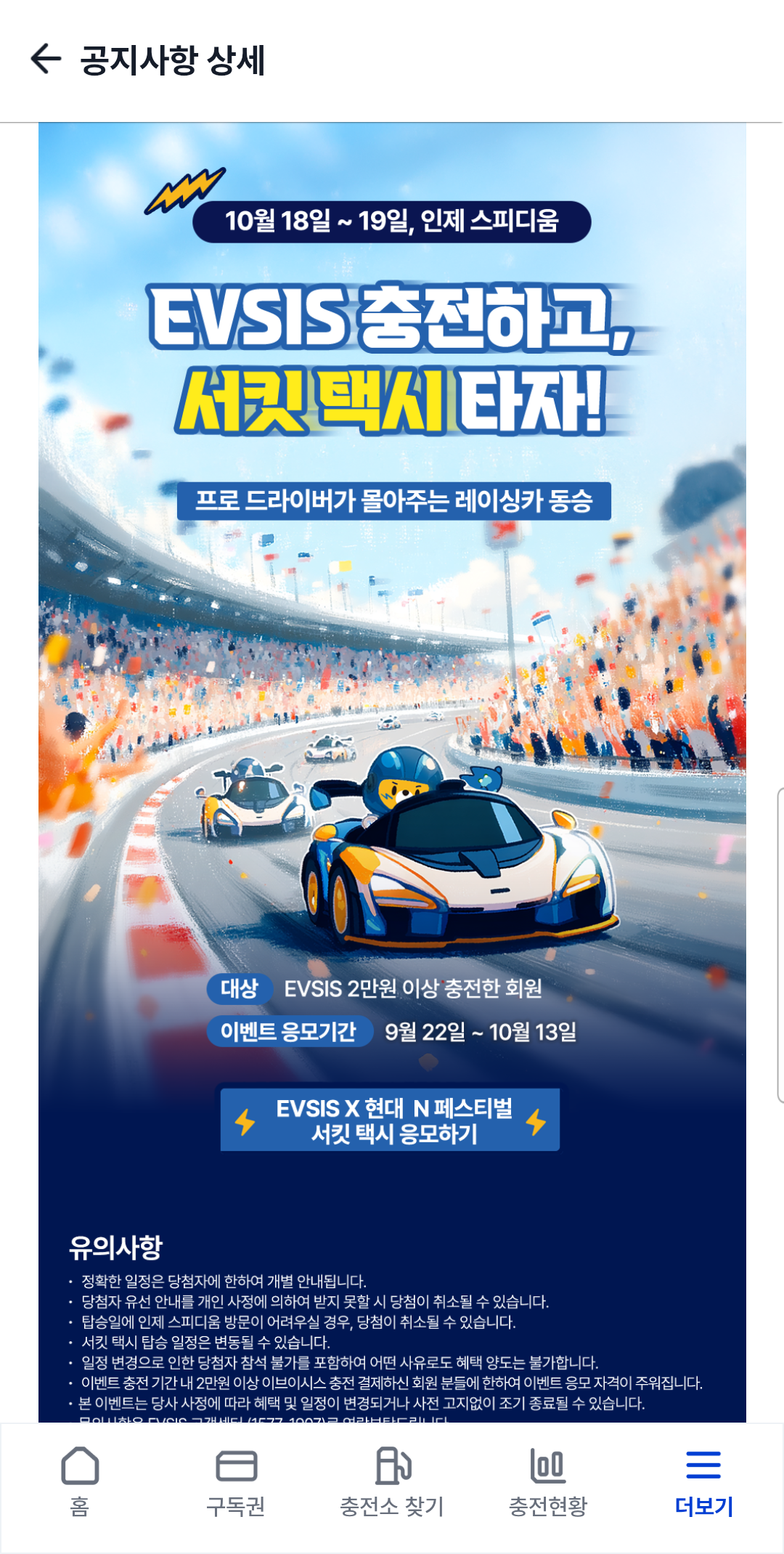 또한, 10월 12일까지 진행되는 ‘현대 N 페스티벌’ 콜라보 이벤트에서는 2만 원 이상 충전한 회원 중 추첨을 통해 서킷 택시 체험 기회가 주어집니다. 프로 드라이버가 직접 운전하는 레이싱카에 탑승해보는 특별한 경험을 할 수 있는 만큼, 전기차 오너라면 꼭 참여해보시길 추천드립니다.