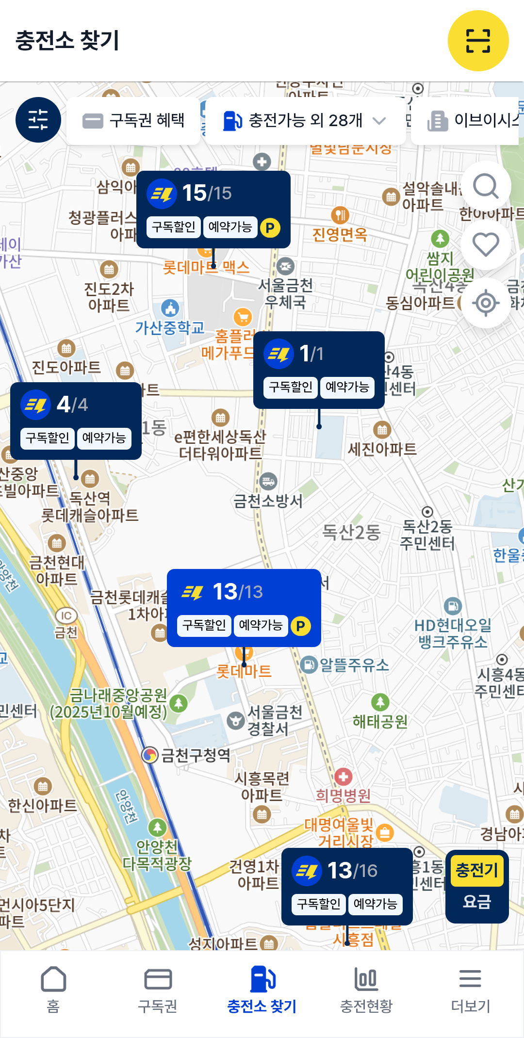 지도 마커에서 충전기, 요금 정보 확인도 가능하고, 구독 할인 적용 여부와 예약 가능 여부 체크도 가능하도록 업데이트 되어 훨씬 이용하기가 편해졌습니다. 무엇보다 주차권제공이나 다양한 서비스를 한눈에 확인할 수 있도록 구성되어 이것저것 확인하고 비교하지 않고 사용 할 수 있어 부담이 없습니다.