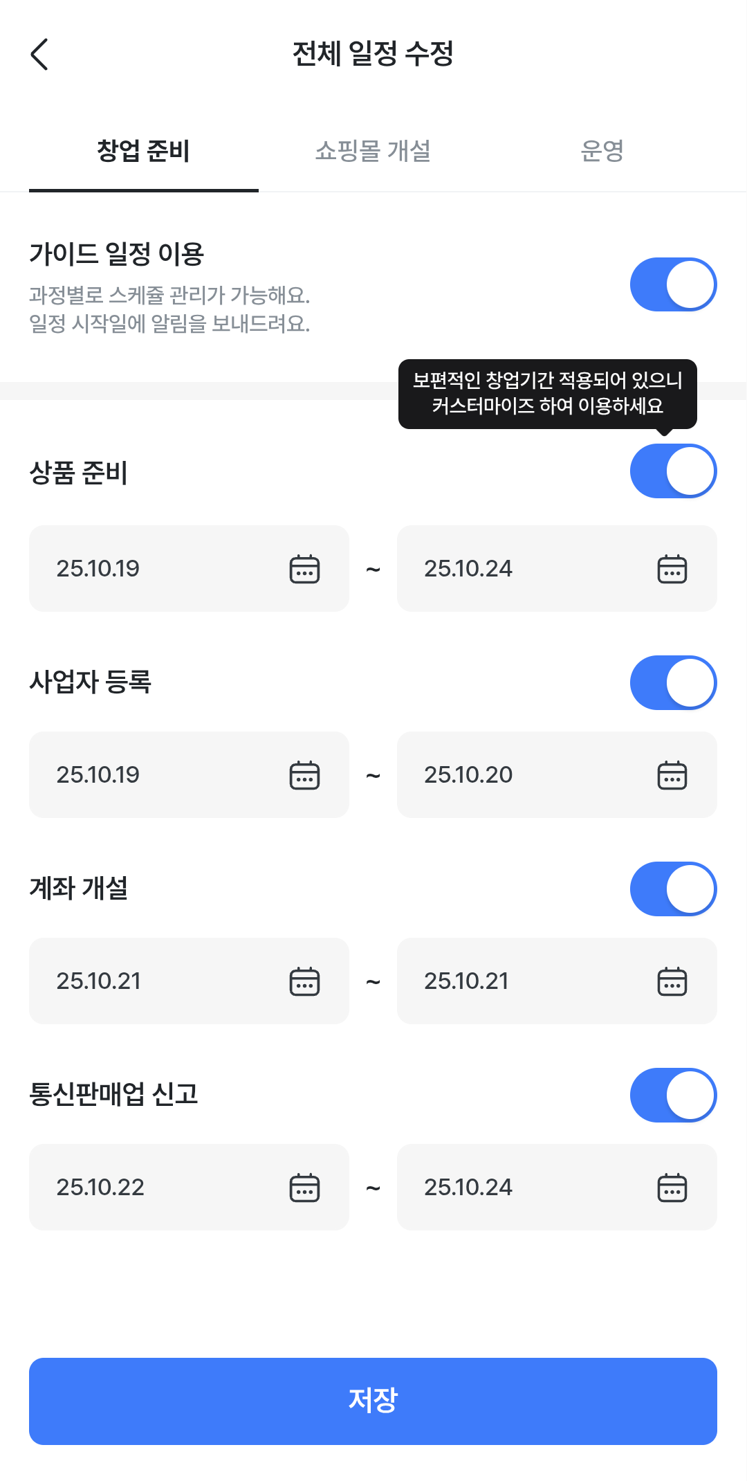 창업을 위해 스토어 및 관련 정보를 입력하면 현재 사업 준비 단계 정보를 확인하고, 어떤 것들을 준비해야 하는지 한눈에 확인할 수 있어 시간을 절약할 수 있습니다. 어디서 어떤 것부터 준비하고 절차를 어떻게 진행해야 하는지 일일이 알아볼 필요 없이 일정에 맞춰 차근히 따라가기만 하면 되니 놓치는 부분 없이 시간도 단축되어 편리합니다.